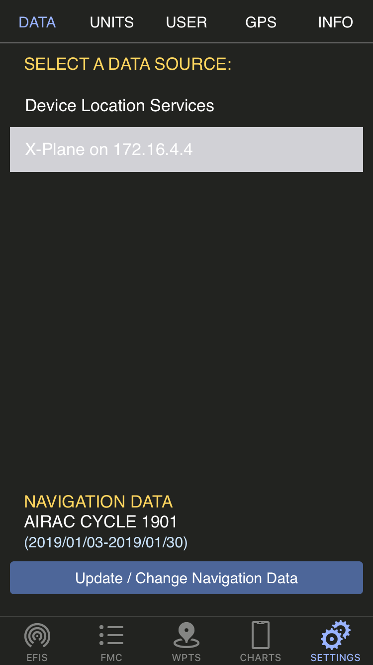 With this mode the application will collect geographical information from the builtin device location services as well as heading when a compass is available and will use these to determine how and where you are moving towards. You can use it standing still to know where you are or to find out the bearing to a certain destination. But you can also use it in a moving vehicle to simulate a full flight experience, tracking your route, your heading, your speed, and doing this all as if you were sitting on a plane. Things like wind speed, direction or outside temperature cannot be collected by the iPad or iPhone; but to make it more fun we have added a bit of magic: take the nearest airport's METAR to get your "virtual" wind speed, direction, temperature and barometric pressure, and use these as if they were real.The X-Plane and MSFS 2020 data sources