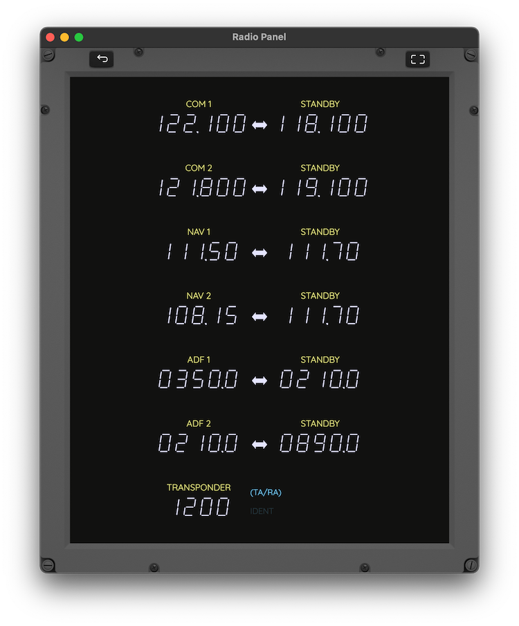 The Radio PanelThe RADIO panel allows access to the radio stack and communication channels. It is accessible via the Launch Pad. On narrow screen devices the radios are split between 4 pages, NAV, COM, ADF and XPDR. On wider windows they are presented in a single page. NAV, COM and ADF have 2 radios each. In order to change them tap on one of the numbers to display a digit input dialpad; enter the desired frequency and press SET. Tapping on the horizontal bidirectional arrow transfers the values from STANDBY to ACTIVE and vice-versa. In simulator data sources the changes in the radio frequencies are retrieved from the simulator and sent back to it for update once changed.