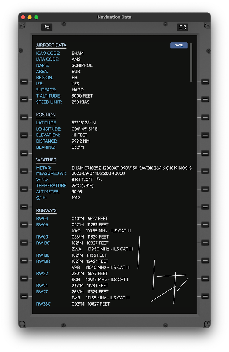 Details PageEach nav data point type can be queried and shown its associated data. Airports are an extremely complete type in that they they include information about the airfield such as name, codes, transition altitudes, position, current weather, available runways, localizers, relative runway orientation, ATC frequencies, and the list of procedures of SID, STAR and Approach types. The following image depicts part of an airport's details page: