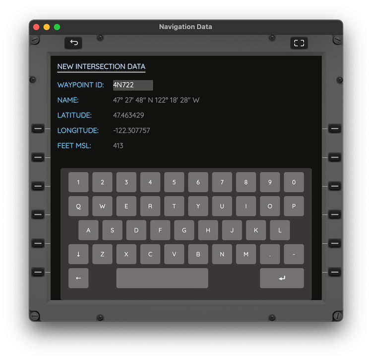 Lookup, Nearby and Saved PointsAirTrack then allows you to browse through that same navigation data by either looking up its identifier or by showing all surrounding objects. The objects found are then separated by type specific pages through LSKs namely, AIRPORTS, VOR/DME/TACANs, FIXes, NDBs and CUSTOM points, and presented sorted by distance from the current location.